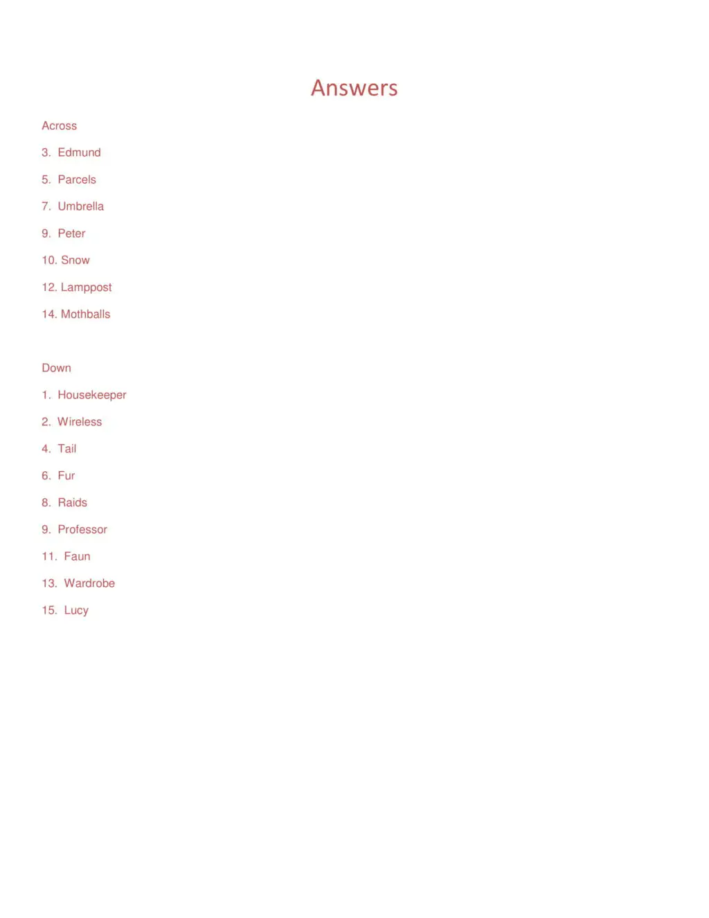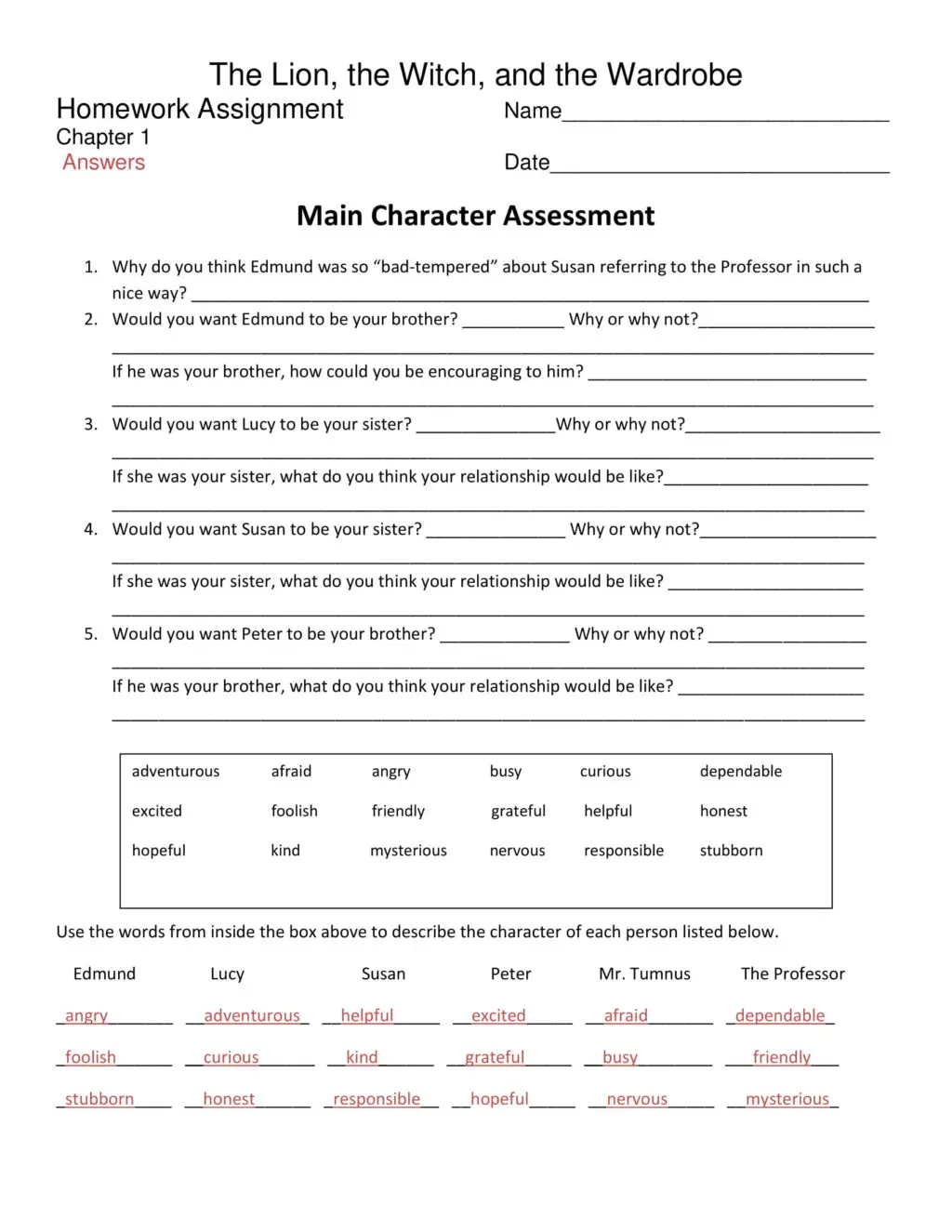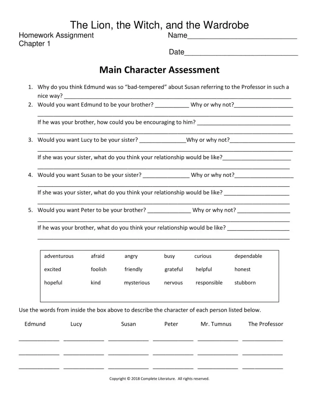 Cover Page Teacher Assistance Sheets Vocabulary Worksheet Vocabulary Visual 1 Vocabulary Visual 2 Comprehension Worksheet Crossword Puzzle Crossword Puzzle Answers Bible Lesson Worksheet Character Questions Worksheet Snack Ideas Game: Lamp-post Sardines Craft: 3D Narnia Lamp Post Craft: 3D Narnia Lamp-post Template Homework Worksheet Homework Worksheet Answers Famous Quote Poster Memory Verse Poster Essay Starter Worksheet Picture Starter Worksheet